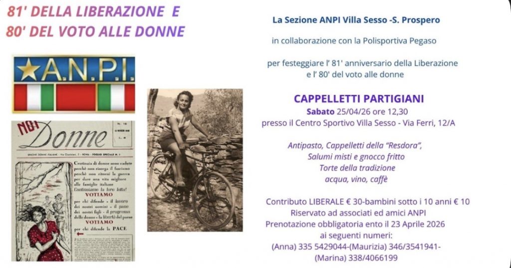 C’è un modo tutto reggiano di stare insieme e fare politica nel senso più alto del termine: trovarsi attorno a un tavolo, ricordare da dove veniamo e decidere dove vogliamo andare. Anche quest’anno tornano i “Cappelletti partigiani” a Villa Sesso, un’iniziativa dell’ANPI locale e della Polisportiva Pegaso che tiene insieme socialità e valori antifascisti.